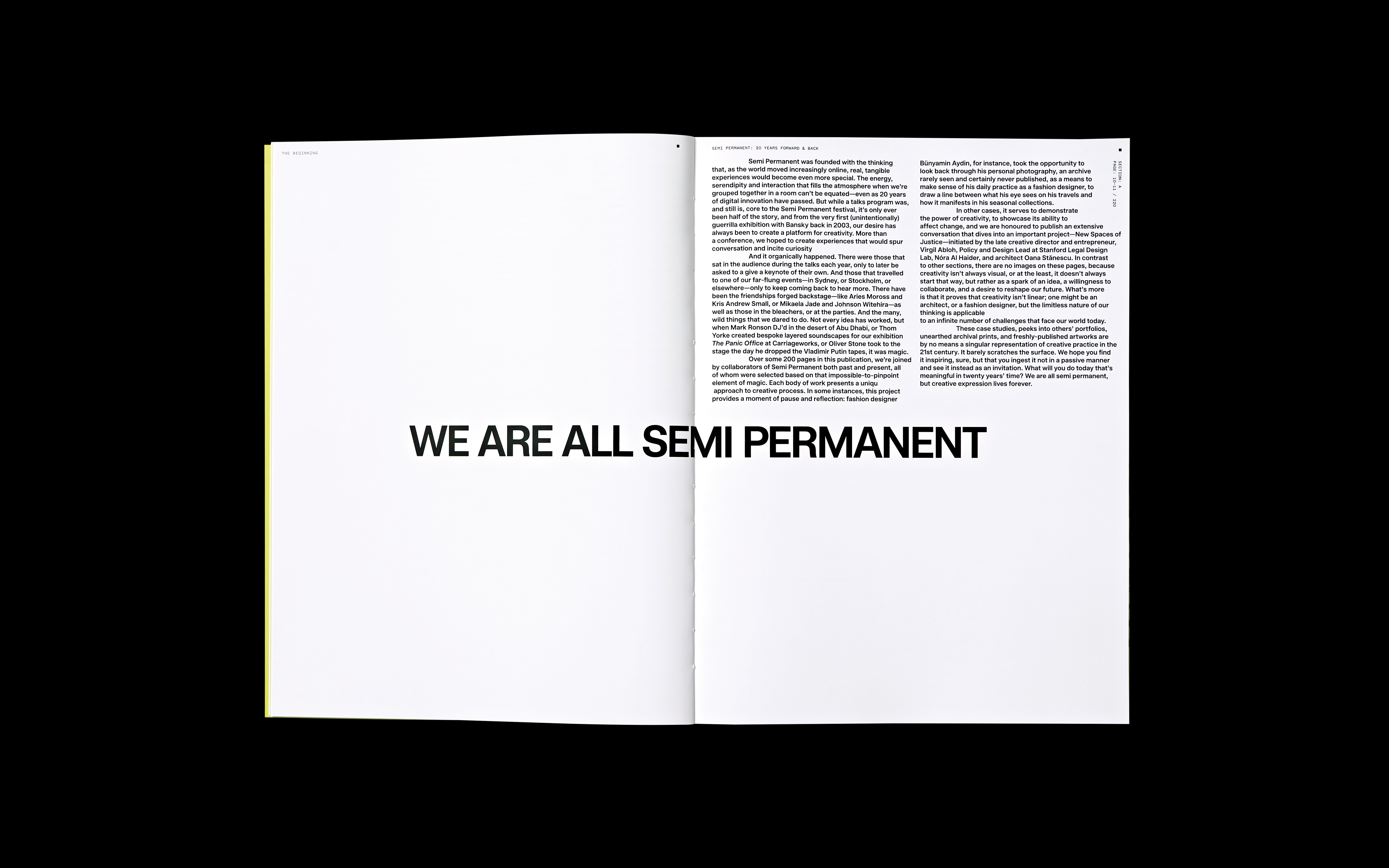 The first major published work from the Semi Permanent Brand Studio, 20 YEARS FORWARD & BACK is presented as a non-linear time capsule exploring two decades of creativity forwards and backwards — charting, reflecting and refracting a broad spectrum of excellence across multiple disciplines.